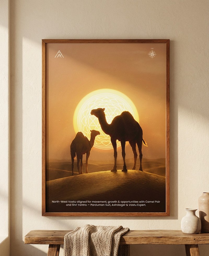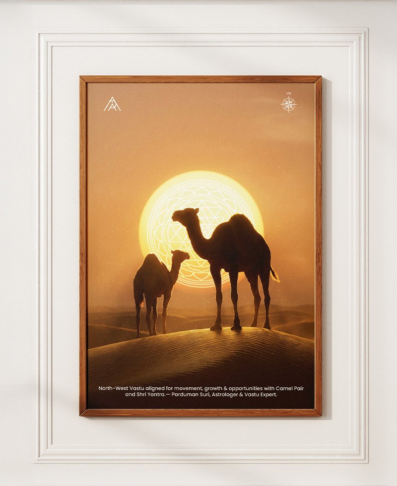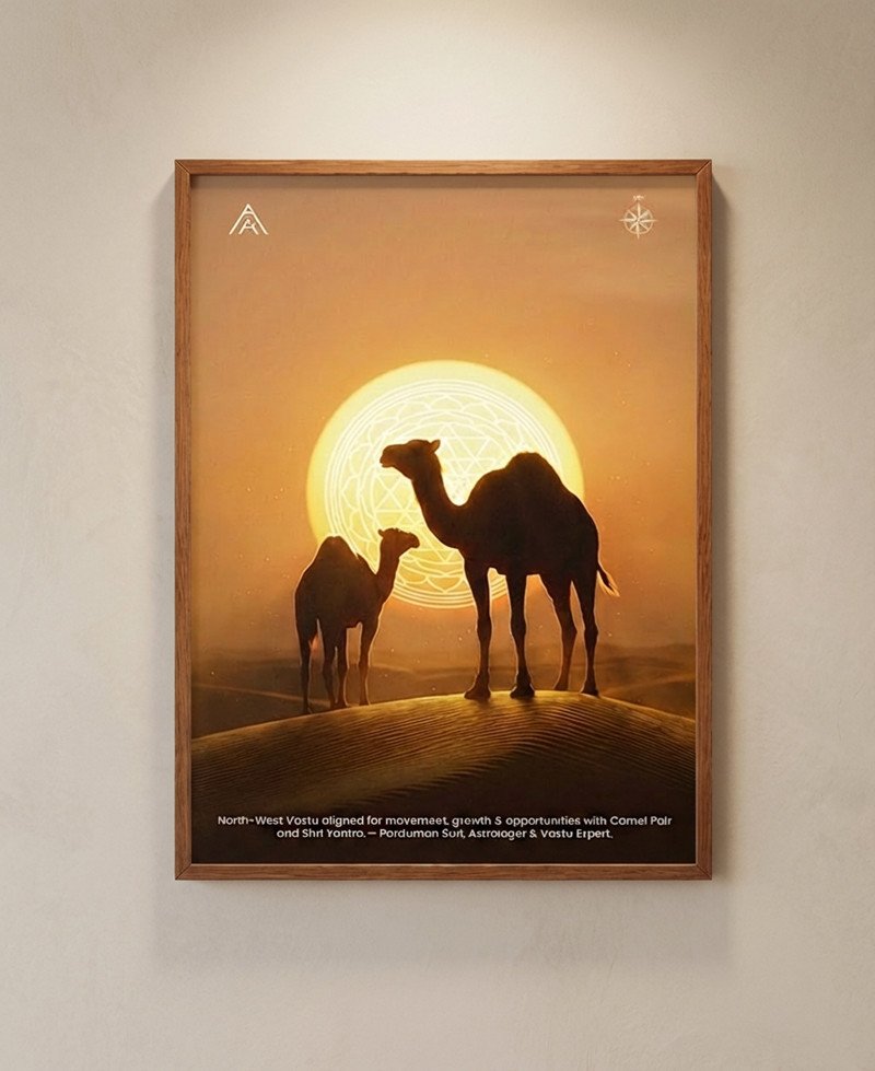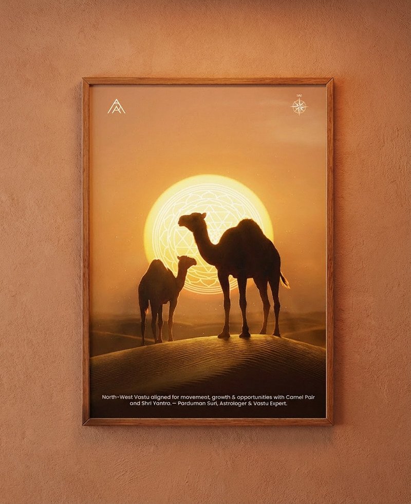 A powerful North-West Vastu painting featuring a Camel Pair and Shri Yantra—designed to activate movement, growth, opportunities, and progressive change in life and business.