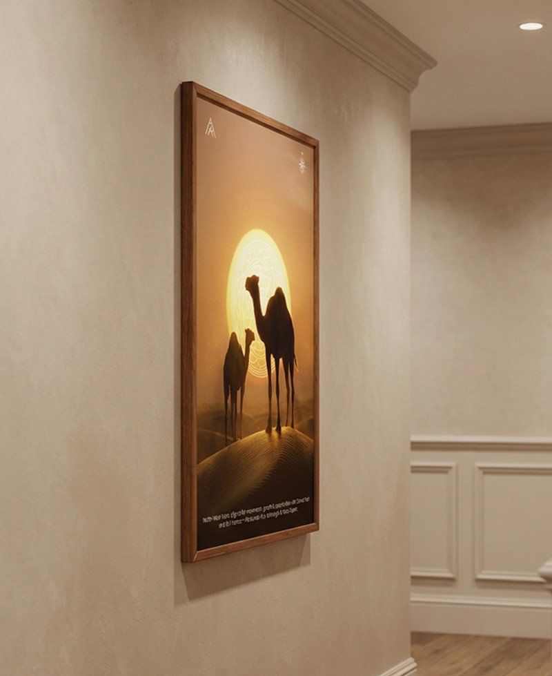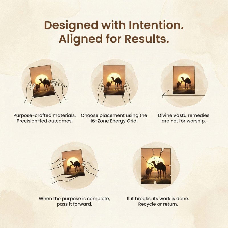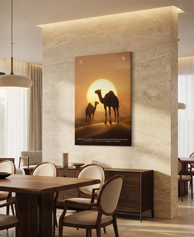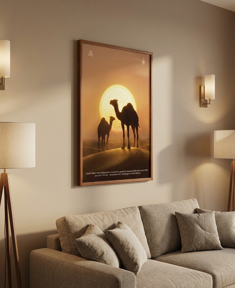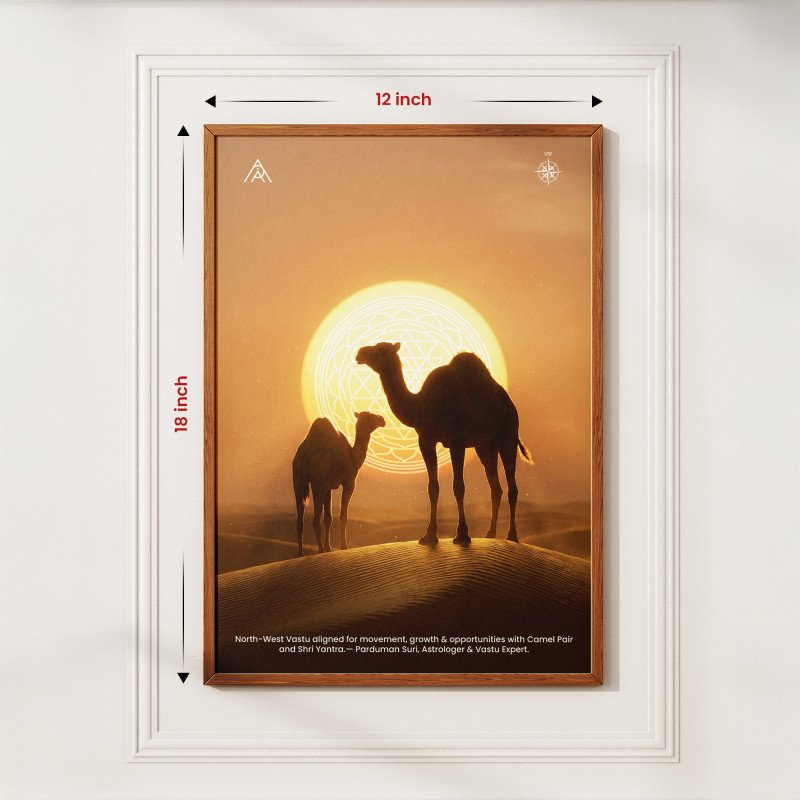 A powerful North-West Vastu painting featuring a Camel Pair and Shri Yantra—designed to activate movement, growth, opportunities, and progressive change in life and business.
