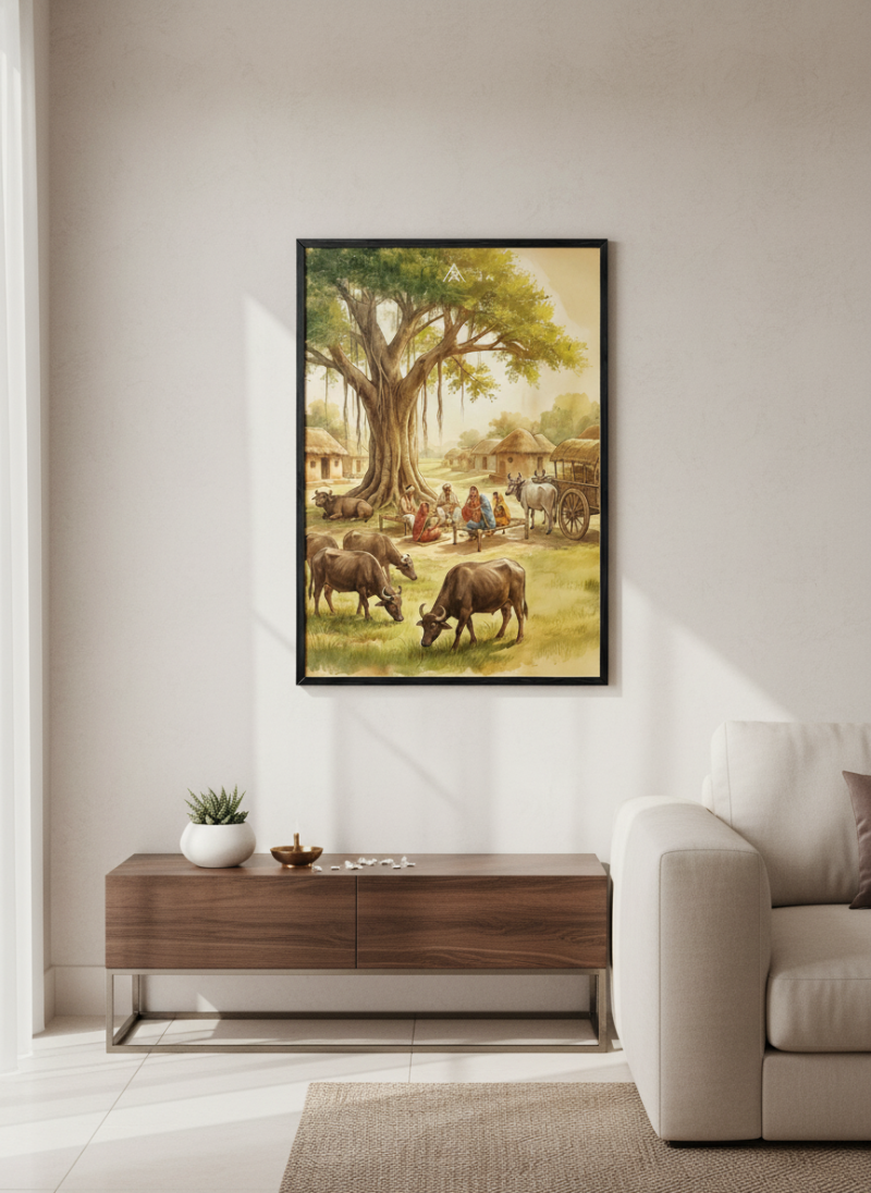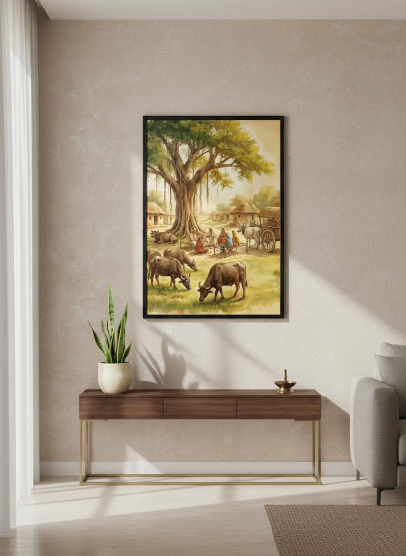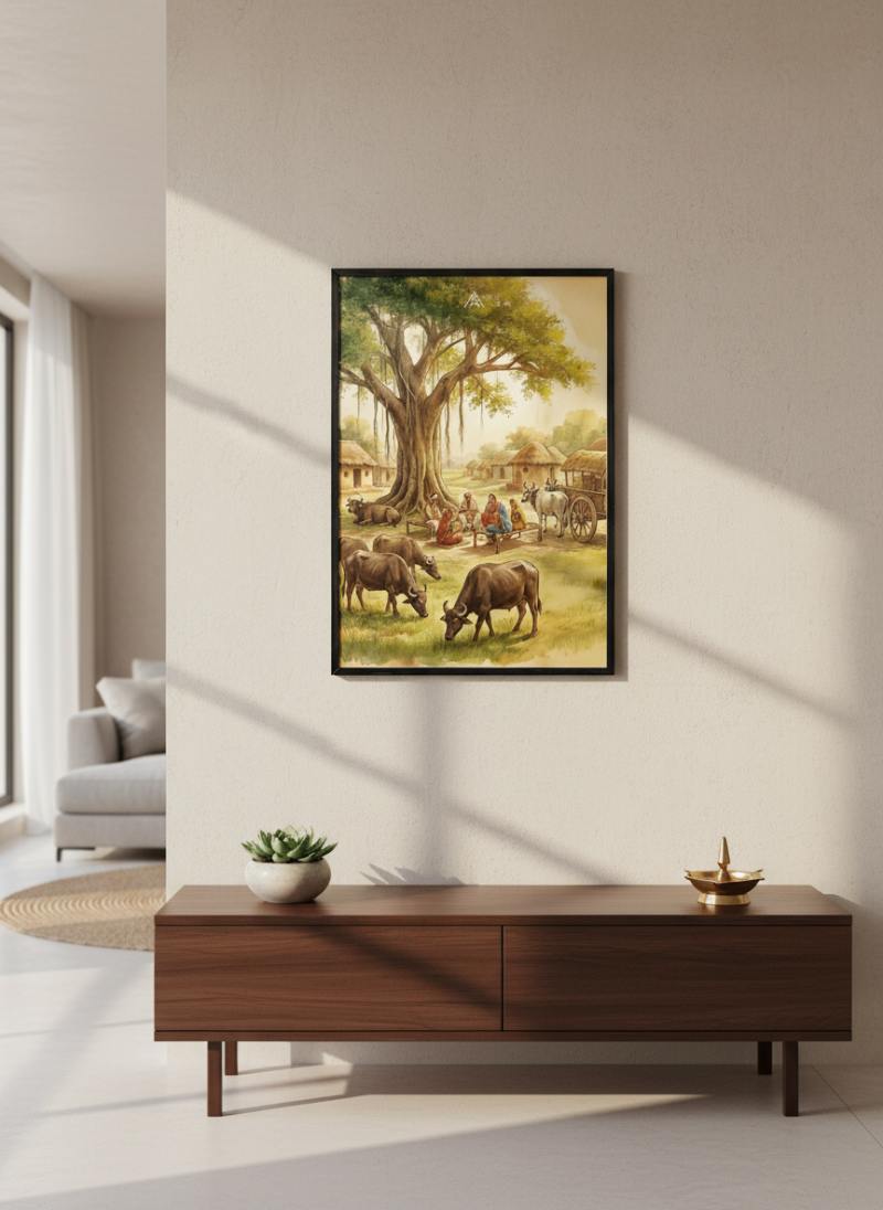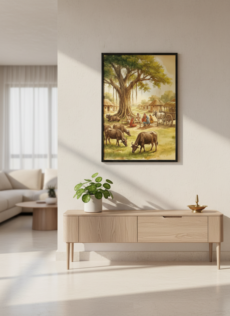 Activate stability, authority, and long-term prosperity with this powerful West Vastu painting featuring grounded energy and harmonious village life.